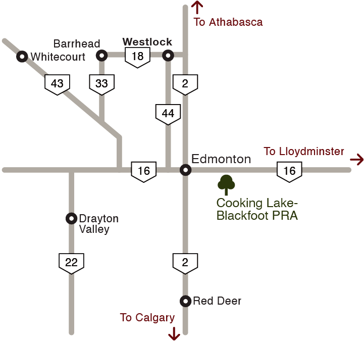 The 97 square kilometre Cooking Lake-Blackfoot Provincial Recreation Area contains forests, pastures and wetlands. It is a multiple use area that supports a variety of activities, including agriculture, wildlife management, natural gas extraction and outdoor recreation.